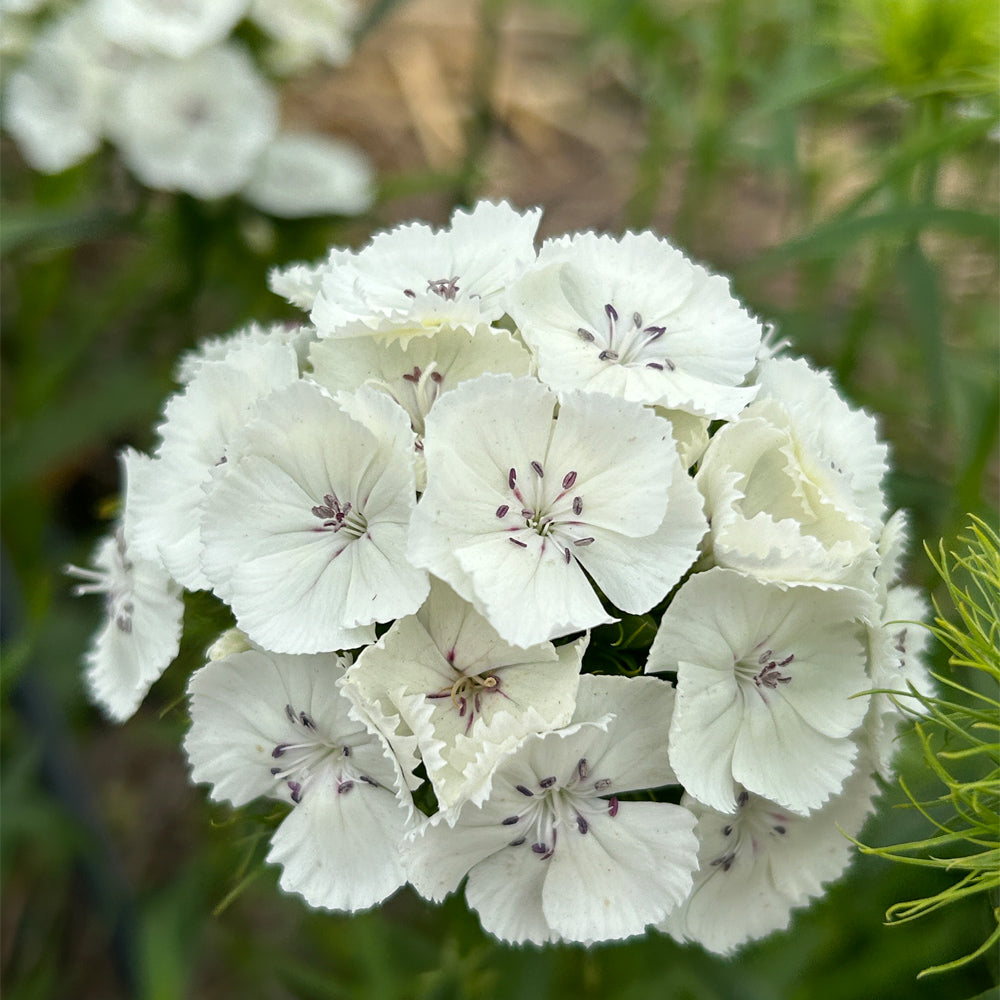 Planta anual de porte compacto y elegante floración. Sus flores blancas, con bordes dentados, aportan frescura y contraste en jardines ornamentales, canteros y macetas. Es resistente, fácil de mantener y florece durante un largo período.