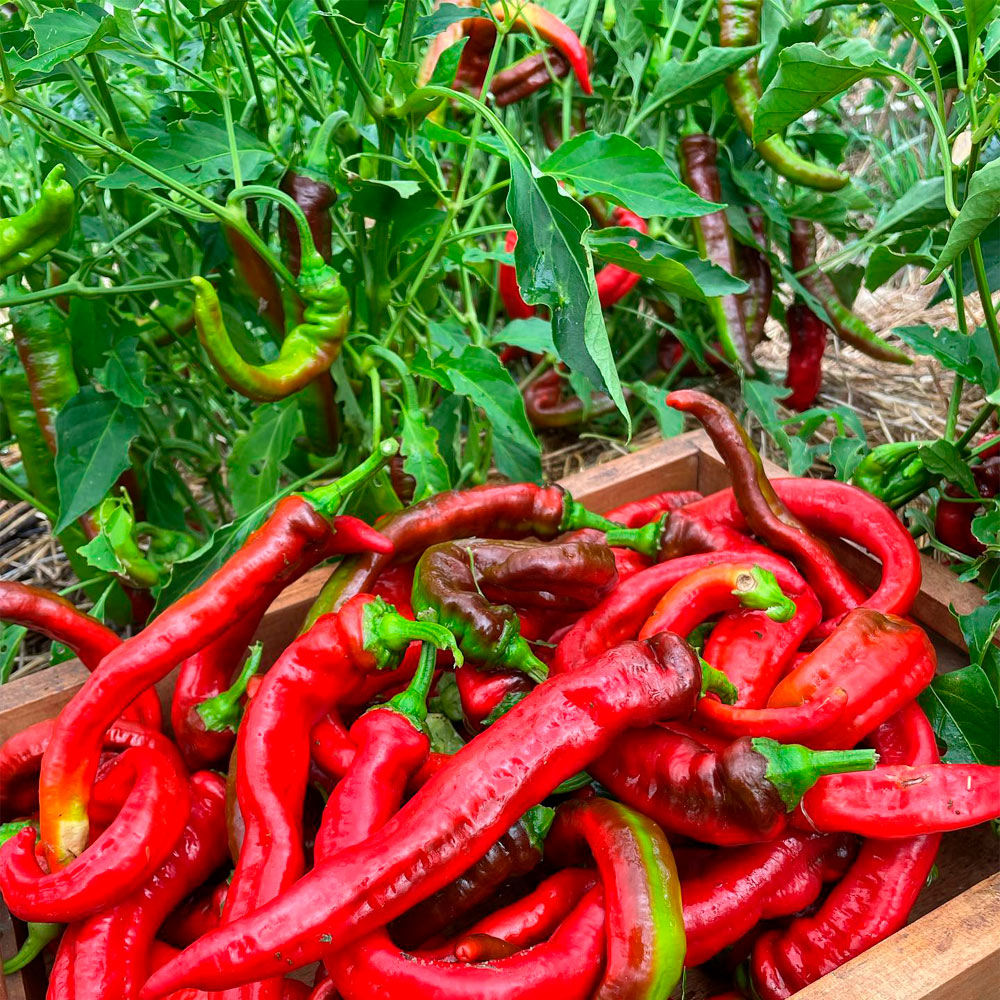 Este es nuestro pimiento favorito. Es prolífico y produce abundantes frutos largos de piel fina, ideal para freír, secar y encurtir. Madura a un rojo profundo con un sabor dulce e intenso.