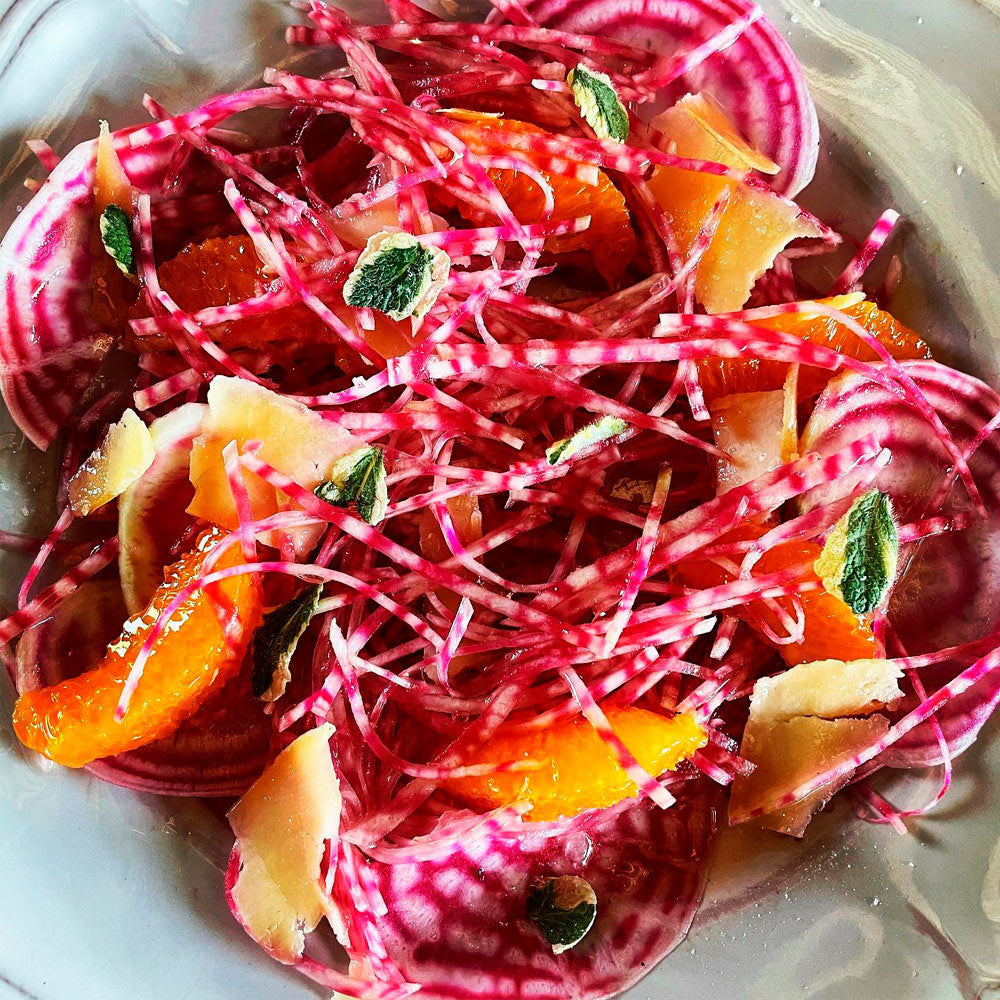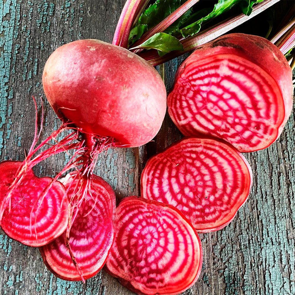 Esta variedad de remolacha tiene anillos concéntricos de color rosa y blanco, que hacen que sea una excelente opción para agregar a ensaladas y encurtidos. Excelente sabor.
