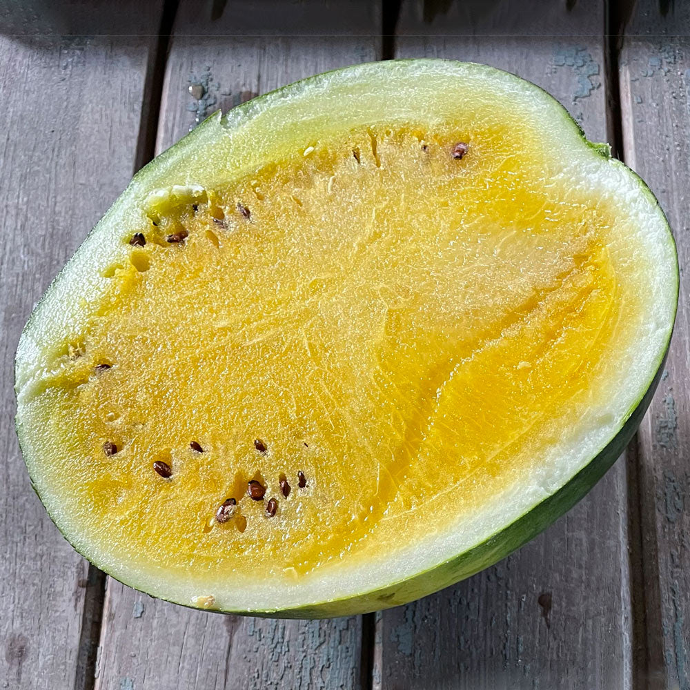 Sandía de pulpa amarilla, dulce y crujiente con piel verde oscuro. Frutos grandes de hasta 5kg.