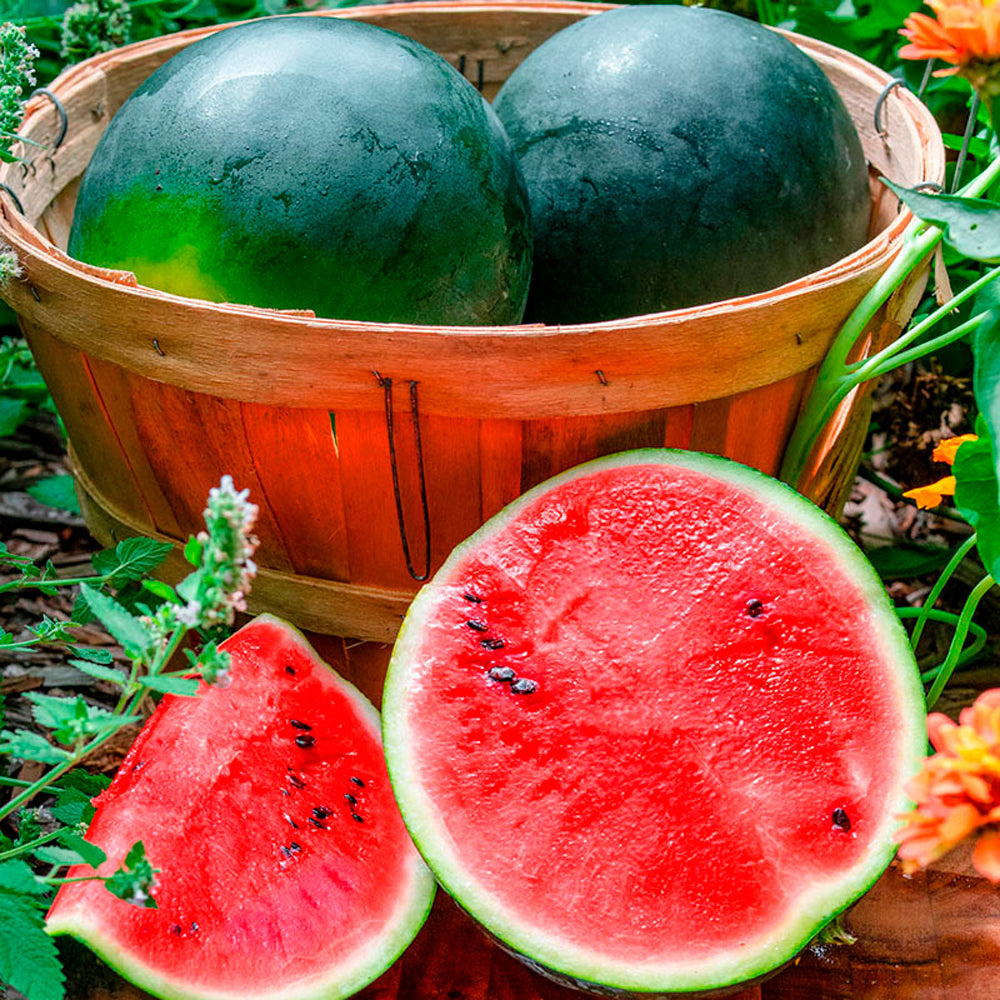 Variedad tradicional mediterránea, con frutos medianos a grandes, piel verde clara con rayas suaves y pulpa roja, firme y jugosa. Sabor dulce equilibrado, ideal para consumo fresco y bebidas refrescantes.