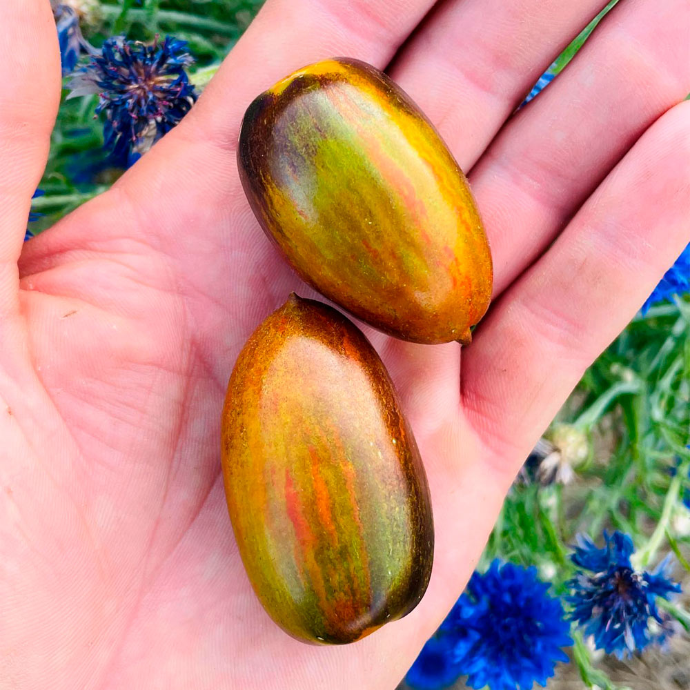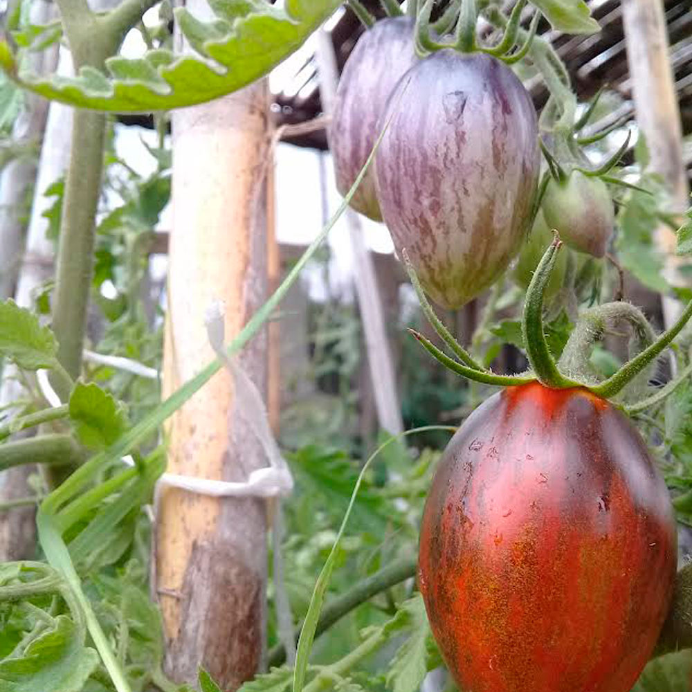 Este Cherry grande y con racimos abundantes presenta rayas moradas, verdes, rojas y azules, y su carne es de color verde oliva. Es muy sabroso y productivo.