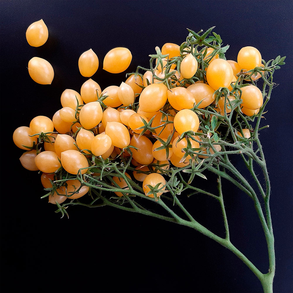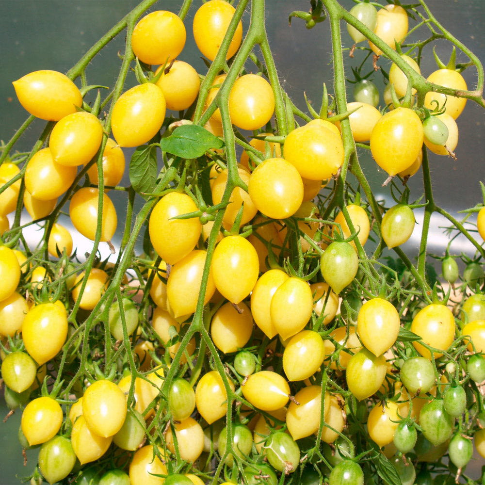 Esto tomates Cherry amarillo pálido son deliciosos. Los dulces frutos son ovalados y tienen un pequeño pico. La fruta se conserva bien y la visión de los racimos de 20 a 40 frutos en las grandes plantas es realmente alucinante.