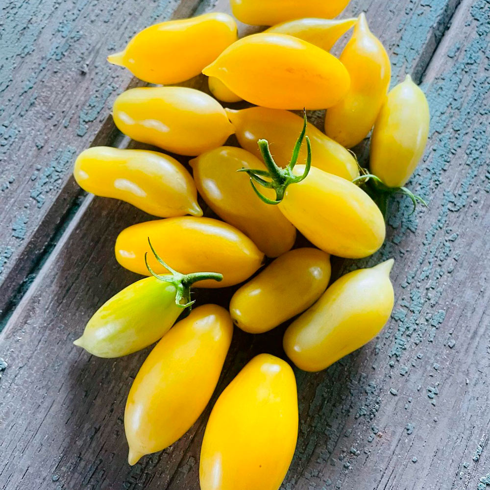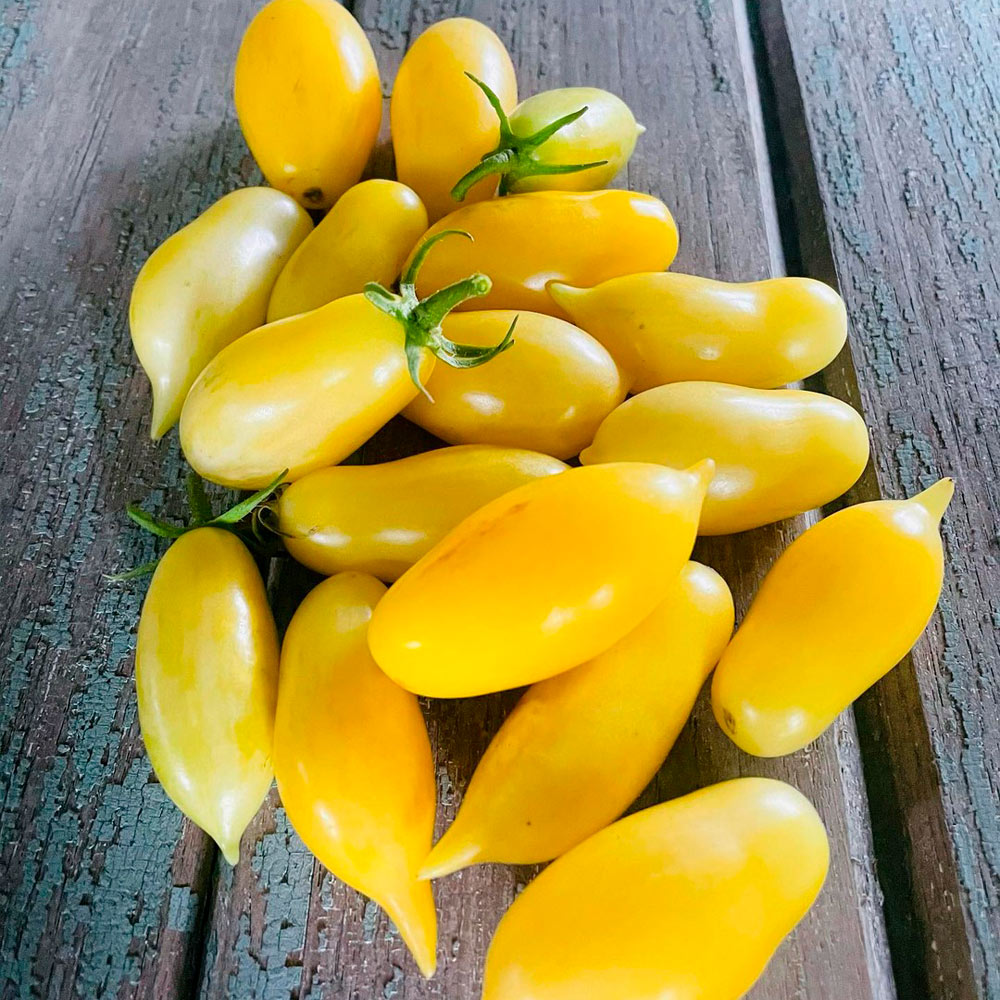 Estos tomates son largos y cilíndricos de color amarillo claro y crema. Variedad determinada, no se poda, crecen como arbusto y son muy productivos.