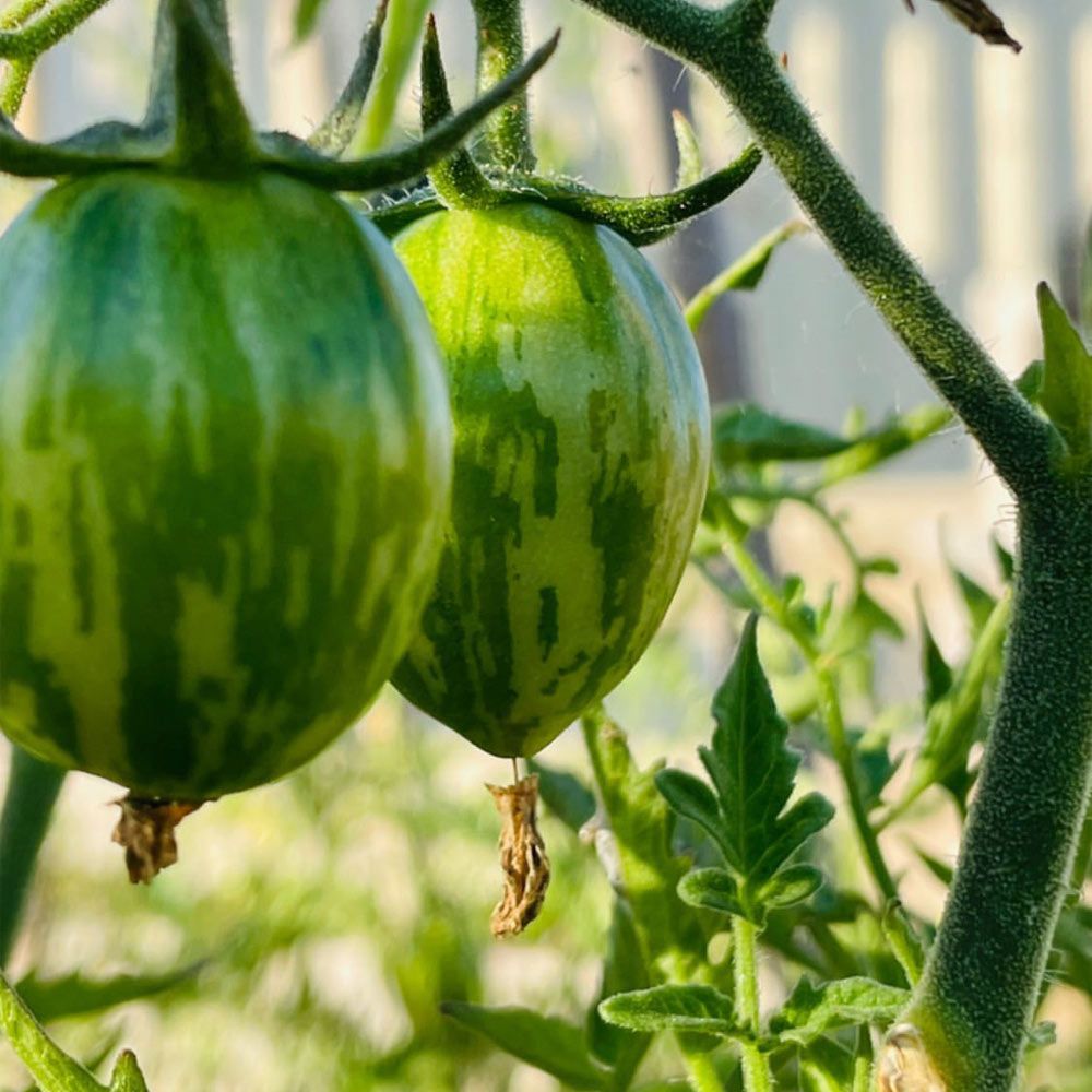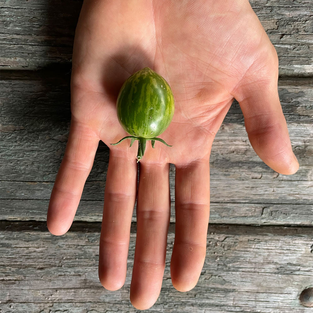 Con un color verde con rayas amarillas y cobre, este tomate es muy dulce y delicioso en ensaladas. Es muy productivo.