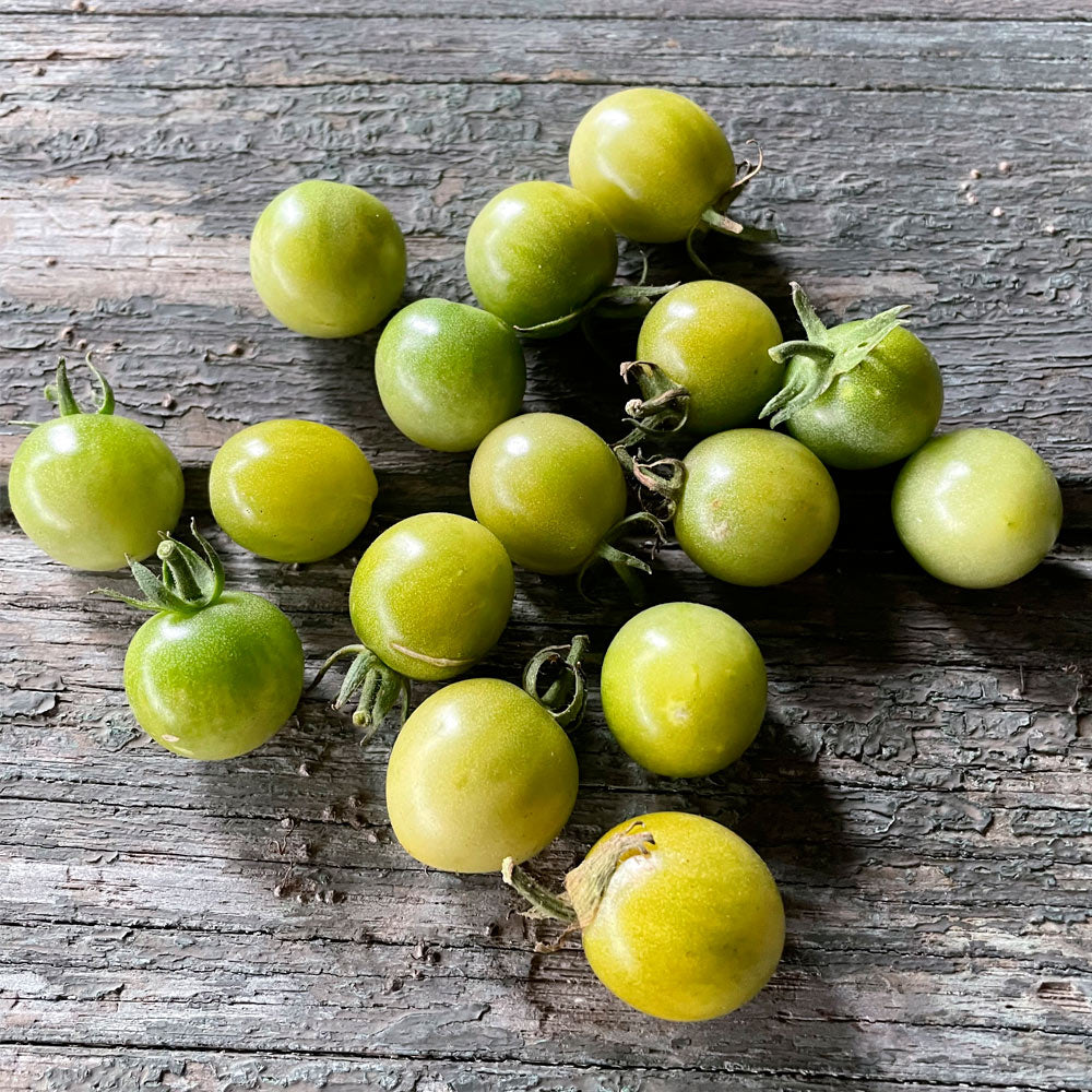 Esta variedad de tomate Cherry produce frutos de color verde claro, tanto por dentro como por fuera, de sabor muy dulce.