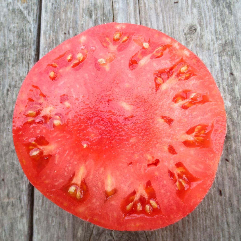 Este tomate rosado y versátil en la cocina tiene un gran tamaño, pocas semillas y una piel fina. Muy dulce.