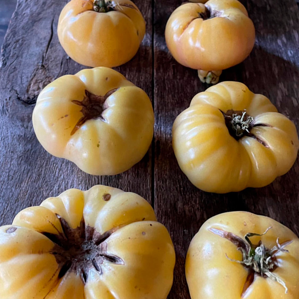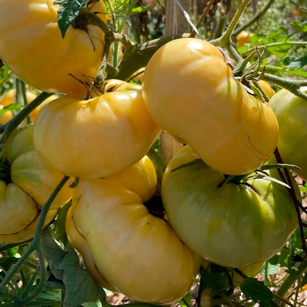 Blanco por fuera y por dentro, estos tomates se vuelven de color crema cuando están completamente maduros.